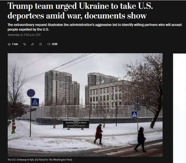 The Washington Post пишет, что еще в начале 2025 года Администрация президента США Дональда Трампа призвала Украину принять на своей территории количество депортированных из США иностранцев.