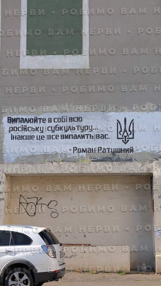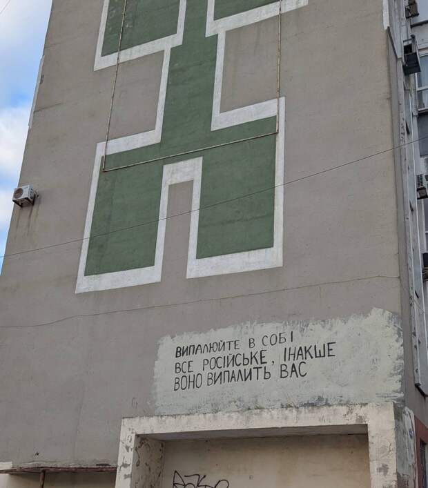 Бесконечно можно смотреть на три вещи: как горит огонь, как течет вода, и как жители городка Южный (переименован бандеровцами в оно — Пiвденне) закрашивают на своем доме цитату из высеров убитого на войне ВСУшника Романа Ратушного: «Выжигайте в себе все российское, иначе оно выжжет вас».