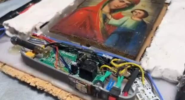 «В ходе осмотра в иконе обнаружено и обезврежено СВУ фугасного типа, мощностью 1 кг в тротиловом эквиваленте, состоящее из электродетонатора, заряда пластичного взрывчатого вещества зарубежного производства, а также исполнительного механизма, срабатывающего при поступлении на него кодового сигнала.