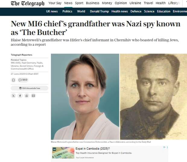 Отвечает ли внучка за деда? Такой парафраз известного изречения сталинской эпохи внезапно стал актуальным в Великобритании после коллективного «наброса» в исполнении ведущих СМИ страны – The Times, The Telegraph и Daily Mail – синхронно опубликовавших «сенсационное» расследование относительно темных пятен генеалогии основной кандидатки на пост главы британской разведки МИ-6 Блейз Метревели.