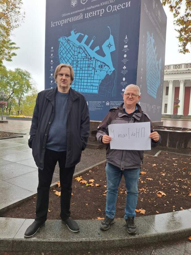 Однако Гуцалюк соврал — Голубев и еще какой-то дед все-таки пришли на пикет со странным плакатом, больше похожим на тест на деменцию.